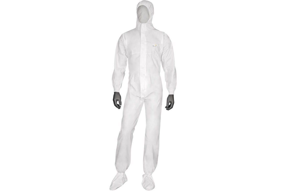 Комбинезон с эластичным капюшоном. Нетканый микропористый ламинированный материал. Двухзамковая застежка-молния, закрытая защитной планкой. Эластичная резинка вокруг лицевого выреза капюшона, на талии и лодыжках. Трикотажные манжеты. Индивидуальная упаковка.