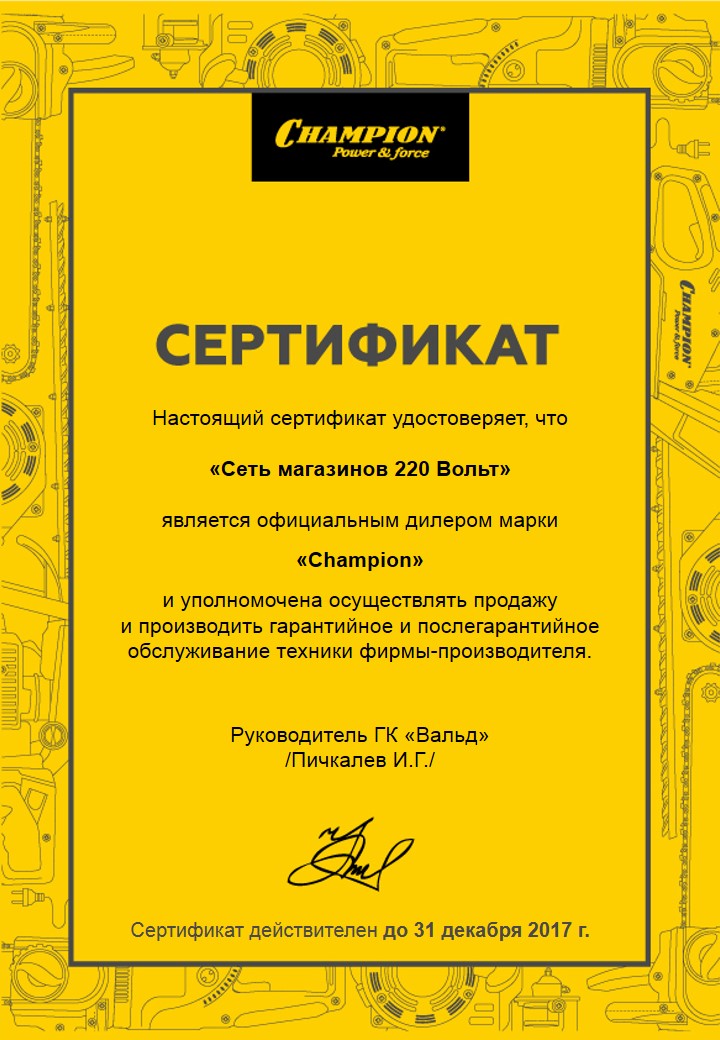 Поскольку разработка и производство широкого спектра электро- и силового оборудования осуществляется на высоком уровне, производитель Champion все быстрее находит признание на рынке. Предназначение продукции, выпускаемой под этой маркой, - в первую очередь, бытовое использование.